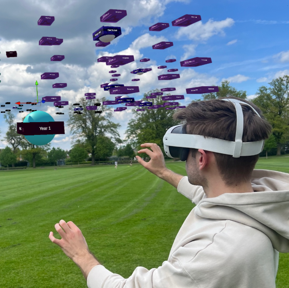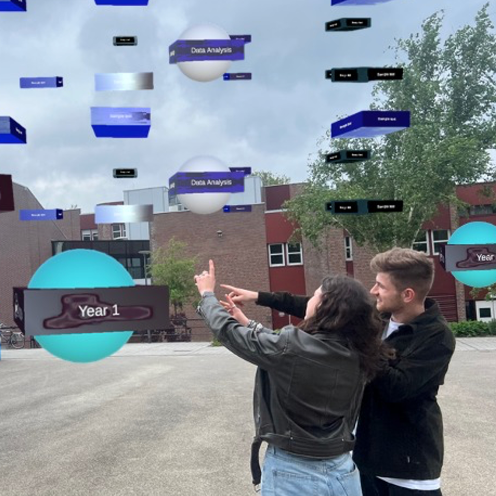 We offer a way to create and access three-dimensional, visualized data in a few seconds, fully automatically, but also with a manual ability. Our application enables to view the text-based data from your text-book in ground-breaking three-dimensional visualizations such as Mind Maps, Flow Charts or Timelines in an infinite big size in the space around you in augmented reality or together with a colleague on the other side of the world, in virtual reality. Using all the three-dimensional space around us allows to create completely new ways to interact with even abstract data and will change the way how we view, present and learn forever.